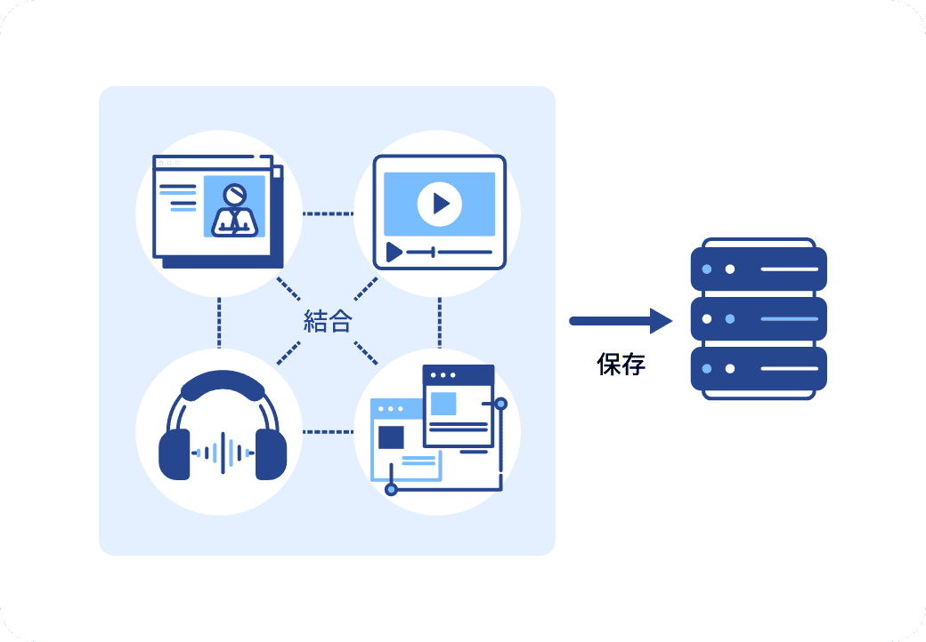 人事データと結合させて保存会議の各メタデータ(会議日時、ユーザー名、メールアドレス)や御社の人事データと録音音声ファイル、動画ファイル、共有画面の録画ファイルと結合させて保存させることが可能です。